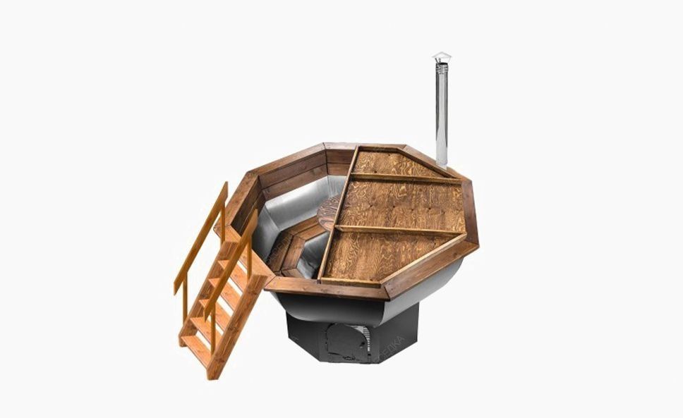 Предлагаем Вашему вниманию банный чан на дровах для купания из нержавеющей стали Aisi 304 с отделкой из лиственницы и подставкой с печью. В комплектацию также входит лестница из лиственницы и дымоход из нержавеющей стали. Банный чан с горячей водой, стоящий на свежем воздухе, доставит огромное удовольствие и принесет пользу для здоровья не только летом, но и зимой. Его можно расположить на природе, вблизи Вашего дома на удобной площадке.  У нас Вы можете заказать чан как без отделки, так и полностью укомплектованный удобным столиком, крышкой и дымоходом. Чтобы растопить чан этого диаметра, Вам потребуется примерно 30-40 минут. Примерно столько же чан набирается водой для дальнейших процедур.