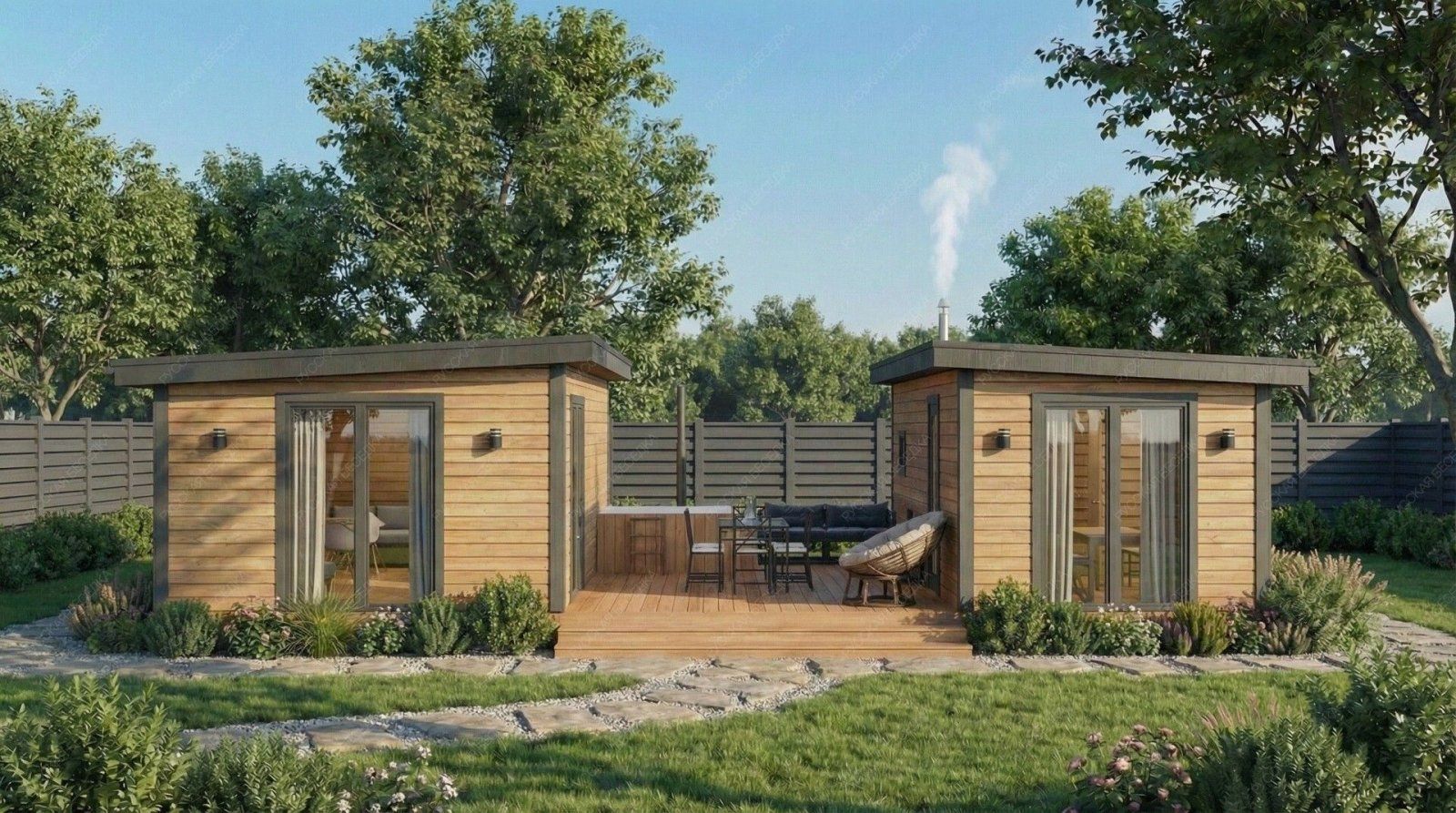 Баня «Эспера» реализует уникальную архитектурную концепцию, где открытая терраса становится центральным связующим звеном между двумя автономными блоками. Такое решение создает исключительную многофункциональность, позволяя одновременно использовать пространства для разных сценариев: шумного отдыха на просторной террасе (23,55 м²) и уединенного расслабления в одном из помещений.  Планировка демонстрирует чёткое функциональное зонирование. Один закрытый блок объединяет большую гостевую комнату (19,38 м²) и санузел, что идеально для приема компании. Второй блок целиком посвящен банным процедурам: здесь расположена светлая парная (5,4 м²) с двумя окнами-форточками, отдельная помывочная и своя компактная комната отдыха. Односкатная крыша и общие габариты 6х11 метров формируют современный, выразительный облик строения.  Использование натуральной древесины и качественный конструктив обеспечивают эффективное теплоудержание и долговечность. Проект «Эспера» предлагает редкий формат — это не просто баня, а целый гостевой комплекс с выделенной релаксационной зоной под открытым небом, где каждая деталь работает на создание атмосферы полного отрыва от городской суеты.