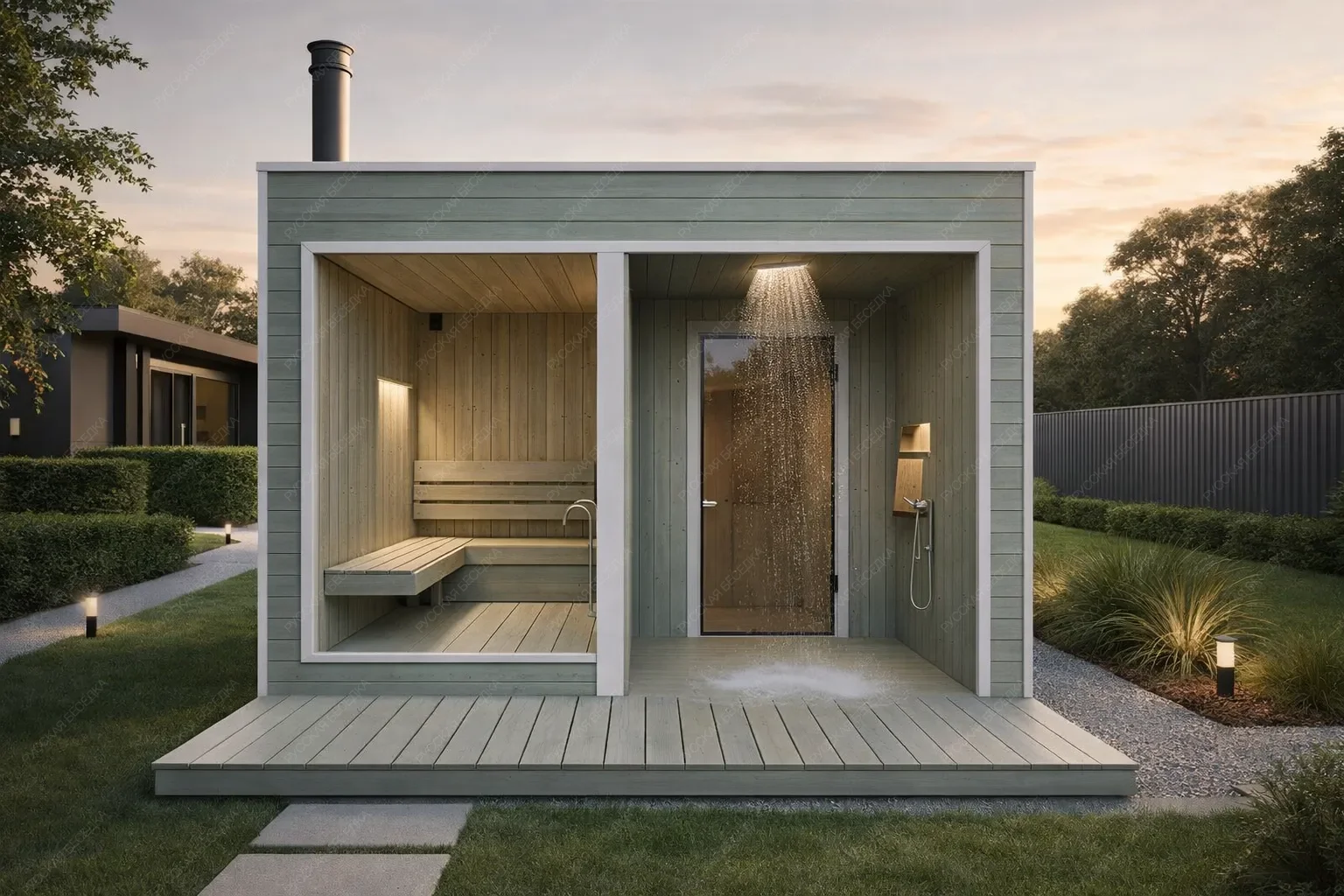 Модульная баня «Борть» формата 5х5 метров с односкатной крышей предлагает лаконичное и концептуальное решение площадью 25 кв.м. для садового участка. Её философия — полное погружение в природу через минималистичную планировку, включающую только парную и открытую душевую зону. Ключевой акцент сделан на панорамном остеклении парной, которое стирает границу между интерьером и ландшафтом, создавая эффект парения прямо в окружении сада. Открытая душевая, организованная под свесом крыши, дополняет эту идею, превращая водные процедуры в продолжение природного контакта. Модульная конструкция обеспечивает высочайшую скорость монтажа и возможность легкой интеграции в любой готовый ландшафт без масштабных работ. Односкатная крыша формирует современный геометричный силуэт. Этот проект — идеальный выбор для ценителей чистых линий, экологичного подхода и максимальной открытости внешней среде, предлагая не просто сауну, а целостное пространство для глубокой релаксации на собственном участке.