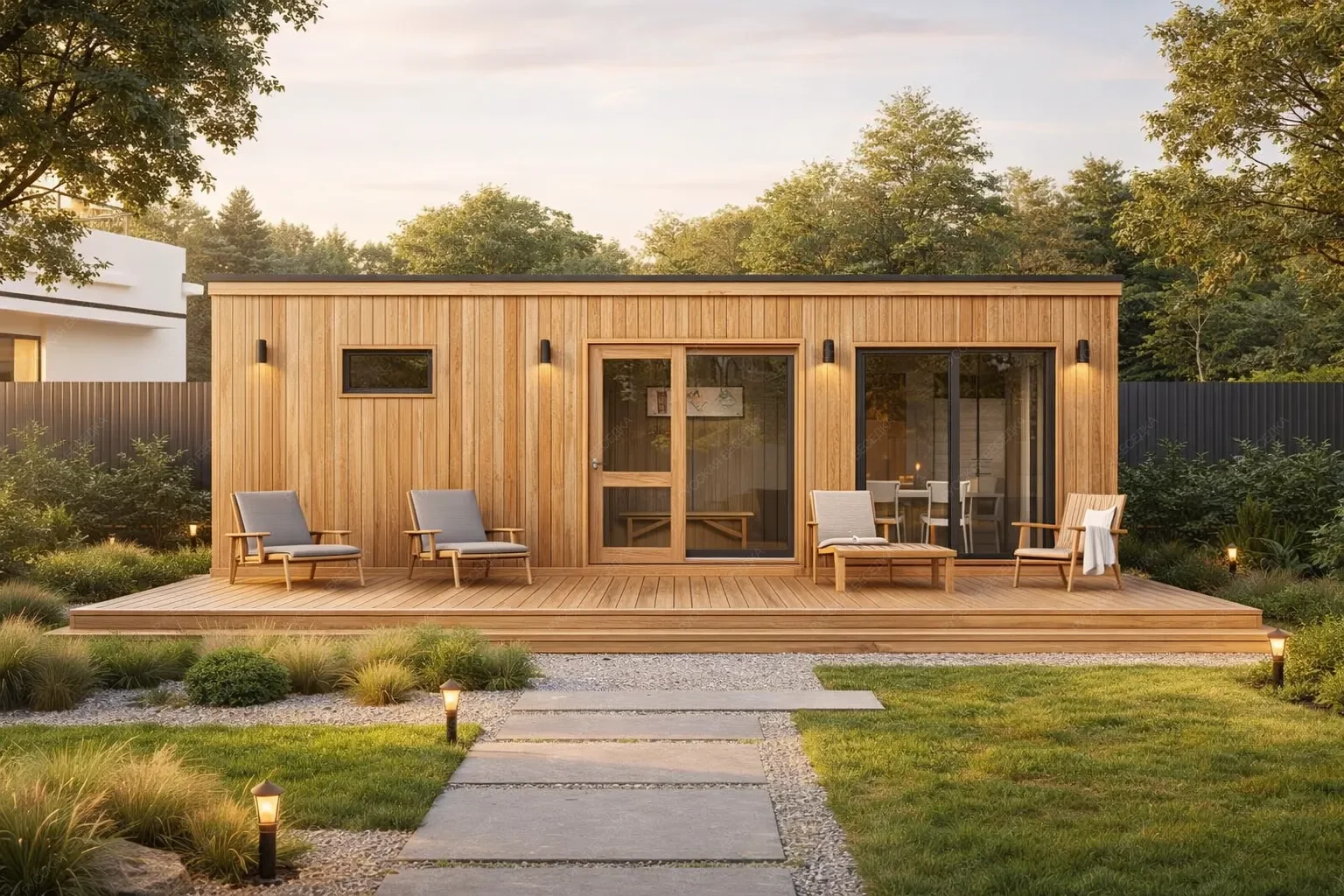Мобильная баня «Лола» с габаритами 9х6 метров и односкатной крышей представляет собой просторное решение площадью 54 кв.м., где основной акцент сделан на гармонии интерьера с окружающим ландшафтом. Ключевым архитектурным элементом является панорамное остекление в комнате отдыха площадью 16,67 кв.м., создающее эффект визуального расширения пространства и обеспечивающее постоянную связь с природой. Это наполняет основное помещение естественным светом, формируя особую атмосферу для релаксации. Планировка отличается рациональным зонированием: функциональная парная 6,56 кв.м., отдельный санузел и холл объединены с просторной гостиной зоной. Открытая терраса служит естественным продолжением комнаты отдыха, значительно расширяя возможности для приема гостей и отдыха на свежем воздухе. Односкатная крыша подчеркивает современный и динамичный дизайн проекта. Мобильность конструкции обеспечивает быструю установку на подготовленном участке без капитального фундамента. Данная модель ориентирована на создание многофункционального гостевого комплекса, где комфорт банных процедур органично сочетается с возможностями для гостеприимства и единения с природой через панорамное остекление.
