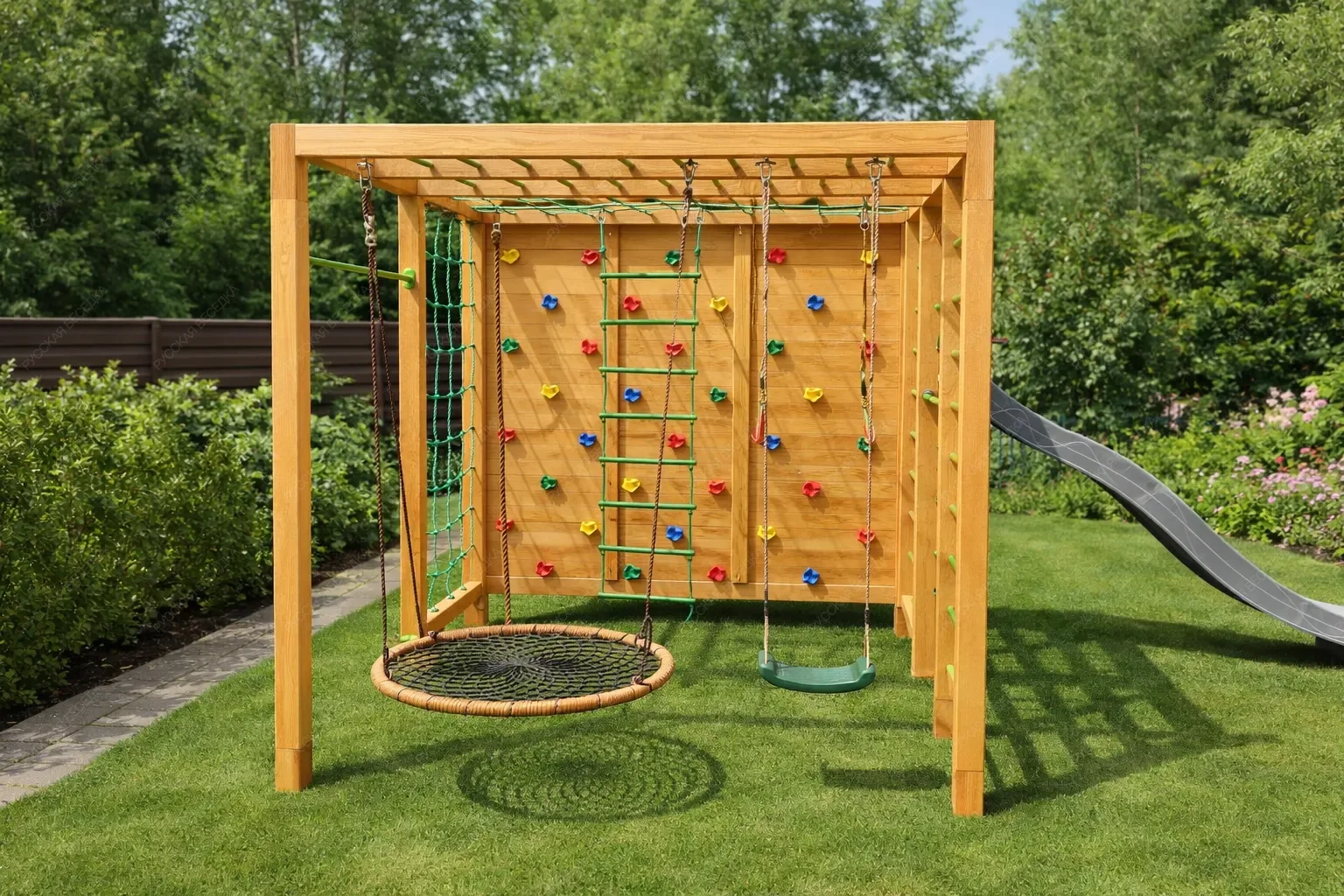Деревянные детские спортивные комплексы — это пространство, где рождается сила, ловкость и уверенность в себе. Натуральное дерево, экологичное и тактильно тёплое, создаёт особую атмосферу уюта и безопасности, принципиально отличаясь от холодного металла. Это не просто снаряды, а настоящий островок приключений, который растёт и меняется вместе с ребёнком. Каждый комплекс представляет собой модульную систему, где базовую конструкцию дополняют разнообразные элементы. Гладкая горка для весёлого скольжения, мини-скалодром для развития координации, классические качели, рисующие в воздухе плавные дуги, и надёжный турник для формирования правильной осанки. Верёвочные лестницы и канаты учат балансу и работе с собственным весом, а баскетбольное кольцо оттачивает точность броска. Секция с лестницей может быть расположена под любым углом, создавая уникальную траекторию для лазания. Такая вариативность позволяет создавать сооружение под конкретные задачи и доступное пространство. Все комплектующие можно комбинировать и заменять, адаптируя игровую зону под взросление ребёнка и появление новых интересов. Конструкции отличаются безупречным качеством обработки: отшлифованная древесина, исключающая занозы, прочные соединения и устойчивость к нагрузкам. Это капитальное вложение в физическое развитие, где каждая деталь продумана для активных игр и безопасного штурма вершин.