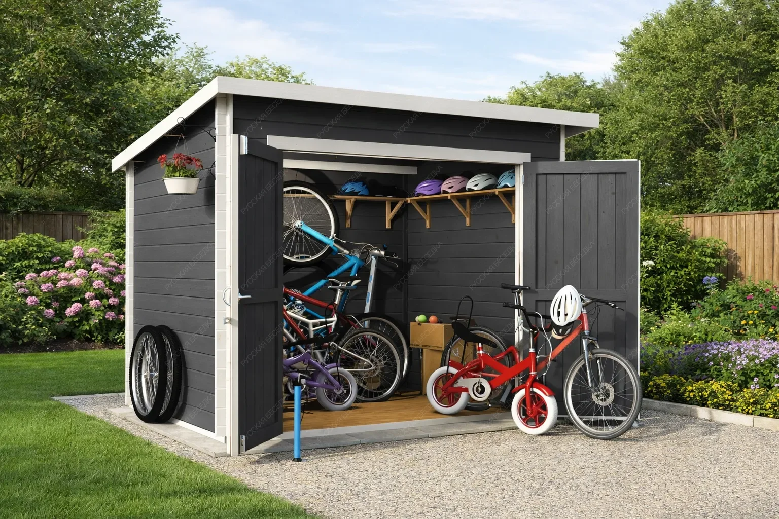 Деревянный гараж для велосипедов — это продуманное решение для хранения двухколёсной техники и сопутствующего инвентаря. Компактное строение из натурального дерева защищает велосипеды от дождя, снега, ультрафиолета и перепадов температур, продлевая срок службы узлов и сохраняя внешний вид рам. Внутреннее пространство организовано с учётом потребностей активных людей: предусмотрены удобные полки для шлемов, насосов, инструментов и смазочных материалов, а также крючки для подвешивания покрышек, велокомпьютеров или рюкзаков. Такая система хранения позволяет быстро найти нужную вещь и поддерживать порядок без лишних усилий. Изготовленный из качественной древесины, гараж гармонично вписывается в ландшафт загородного участка или городского двора, не нарушая эстетики окружающей среды. Дерево обеспечивает естественную вентиляцию, предотвращая образование конденсата, который вреден для металлических деталей. Конструкция рассчитана на длительную эксплуатацию и может быть выполнена в различных размерах, чтобы вместить от одного до нескольких велосипедов. Надёжные крепления и устойчивость к ветровым нагрузкам гарантируют сохранность имущества даже в сложных погодных условиях. Аккуратное размещение велосипедов освобождает полезную площадь гаража, сарая или балкона, делая повседневную жизнь более комфортной и организованной.