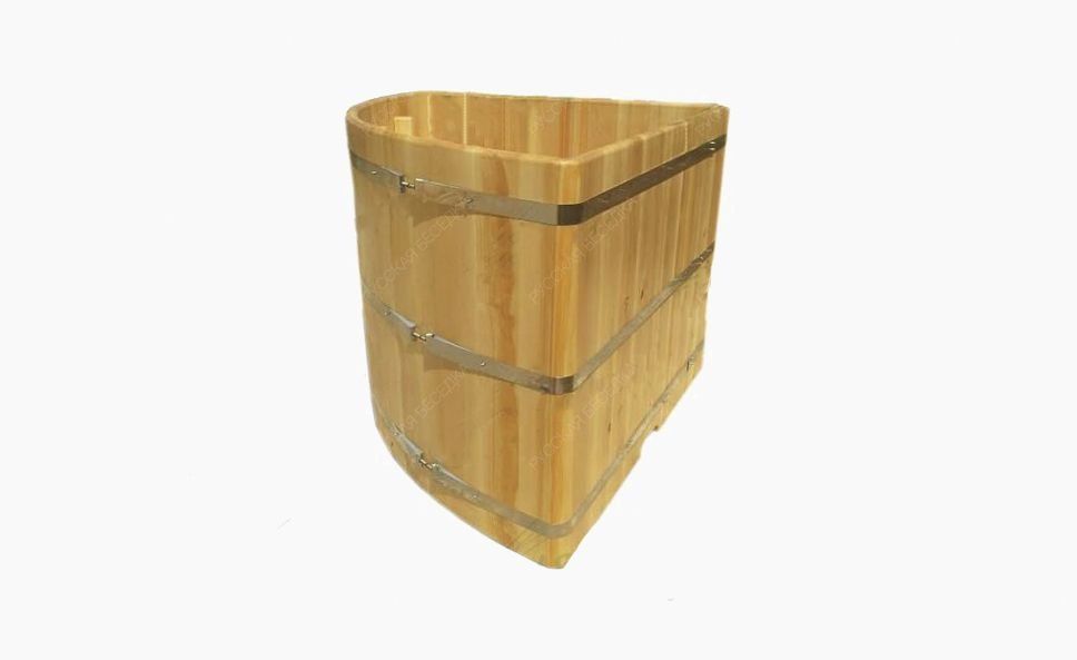 Данная купель, изготовленная из древесины кедра, оптимально подойдет для установки в помещении. Ведь угловые купели помогают рационально расходовать место. Пространство внутри купели также распределено оптимально. В ней есть сиденье, лесенка и отверстие для слива воды. Также купель оборудована внешним трапиком. Словом, все условия для комфортного приема процедур соблюдены. Угловая купель стянута стальными обручами, а ее стенки имеют толщину 4 сантиметра. Это сделано для того, чтобы купель могла служить очень долго. Наполнять купель можно как холодной, так и горячей водой. Воду при помощи специальной печи, которая приобретается и устанавливается отдельно, можно нагревать и непосредственно в купели. Эта угловая купель сделана из древесины кедра. И это означает, что помещение, где будет установлена купель, наполнится свежим ароматом. А воздух в нем всегда будет чистым. Вода, набранная в кедровую купель, приобретет целебные свойства, и вы почувствуете это уже после нескольких процедур.