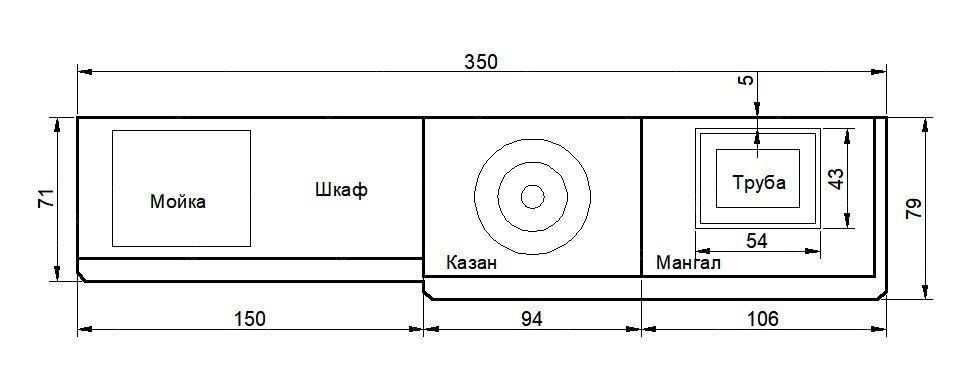 В стандартном варианте отделка столешницы, вертикальных колонн и горизонтальных полос выполнена из керамогранитной плиткой, а труба, крыша и стены - из мраморной крошкой. Ниша для дров темно-коричневого цвета - без отделки. Задняя часть барбекю - без отделки.