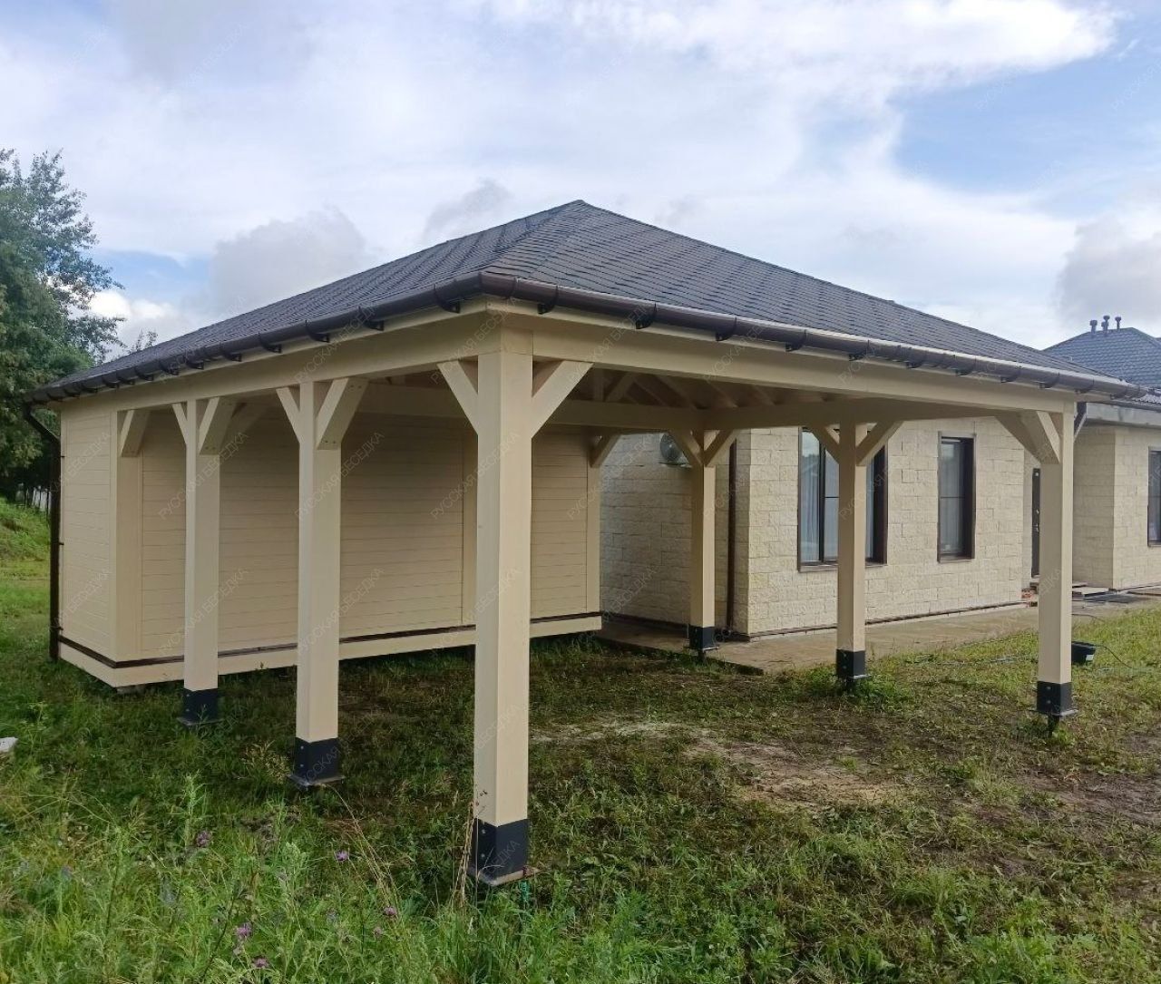 Для производства всех элементов навеса используется только отборная древесина без малейших дефектов, прошедшая камерную сушку и пропитку антисептиками. Навесу после защитной обработки лаком не страшны высокая влажность, а значит, можно быть уверенным, что дерево не растрескается, не разбухнет и не покоробится.
