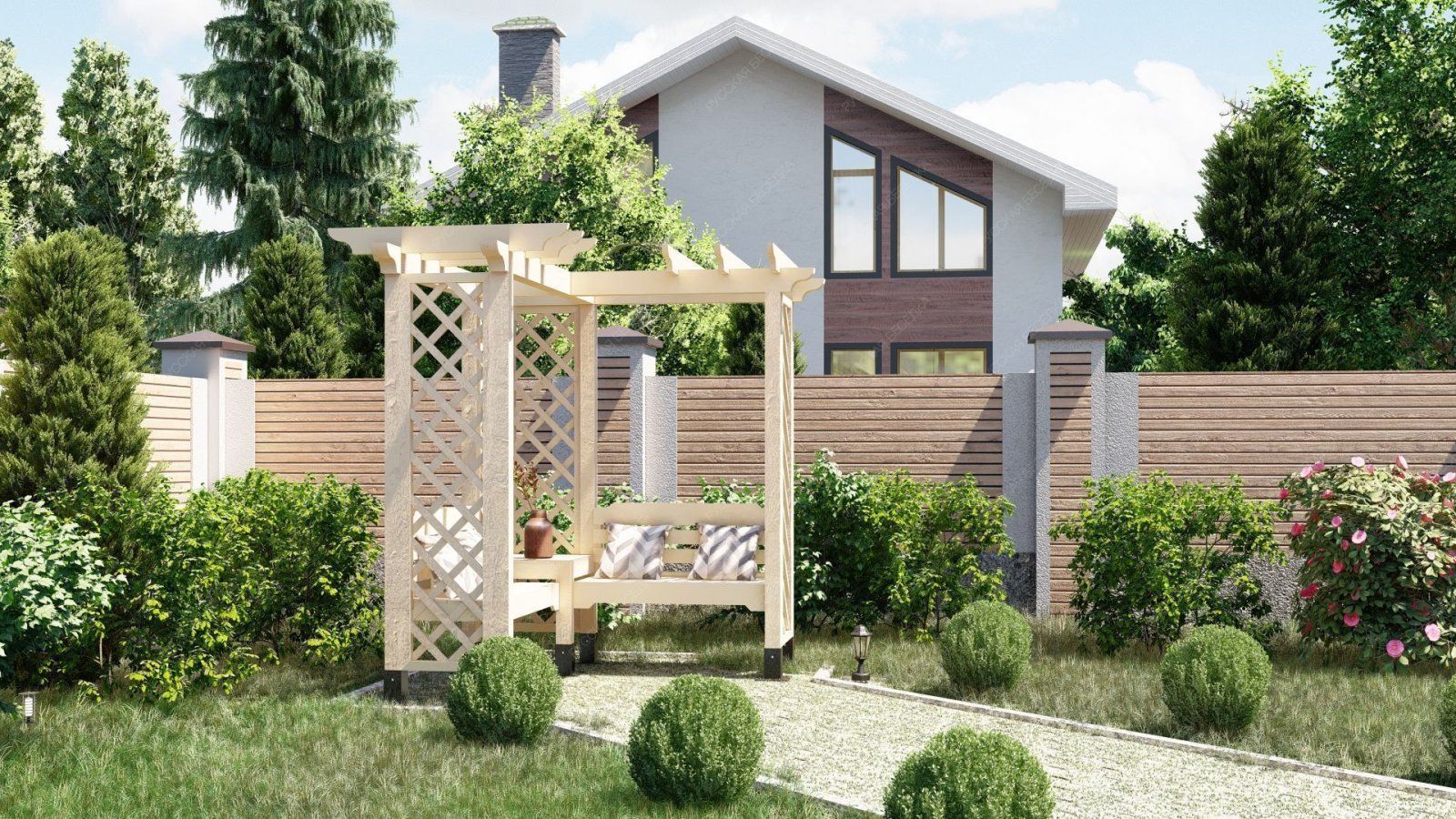 Деревянная пергола придаст вашему садовому участку теплую и уютную атмосферу.Также пергола может служить опорой для плетущихся растений - только представьте, как приятно находиться в окружении цветущего клематиса или пышных роз! Дополнительные элементы, такие как встроенное освещение, декоративные решетки, качели или скамейки, могут усилить визуальный эффект и создать еще более комфортное пространство. А если в конструкцию перголы добавить подиум, то он может служить местом для расслабления или стать сценой для семейных мероприятий.