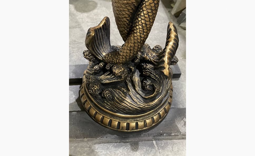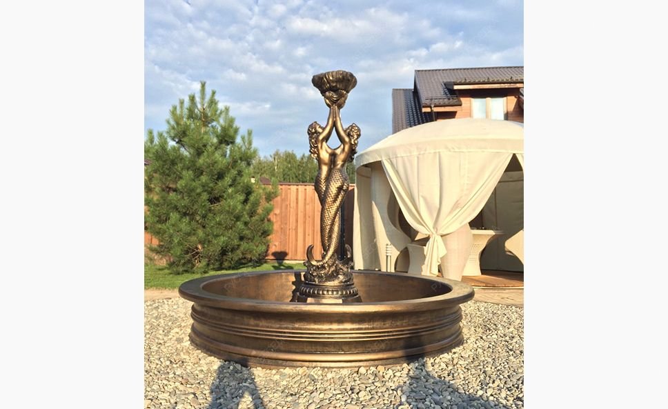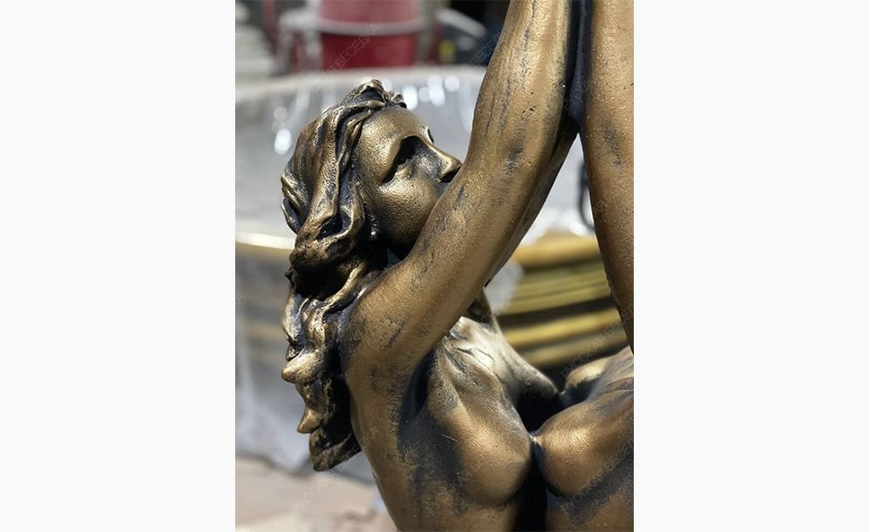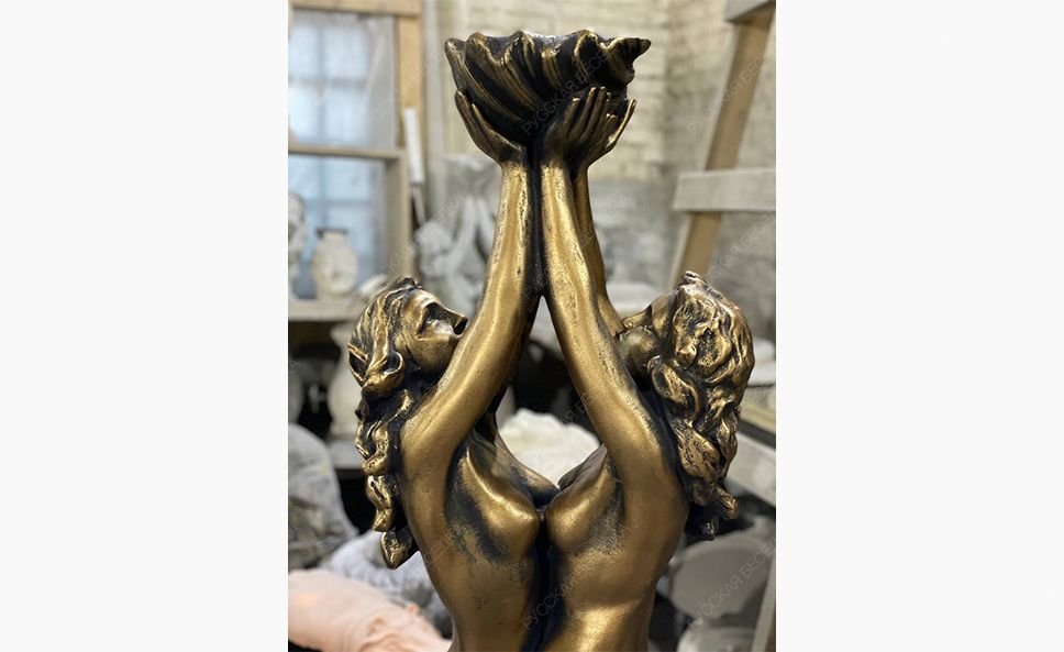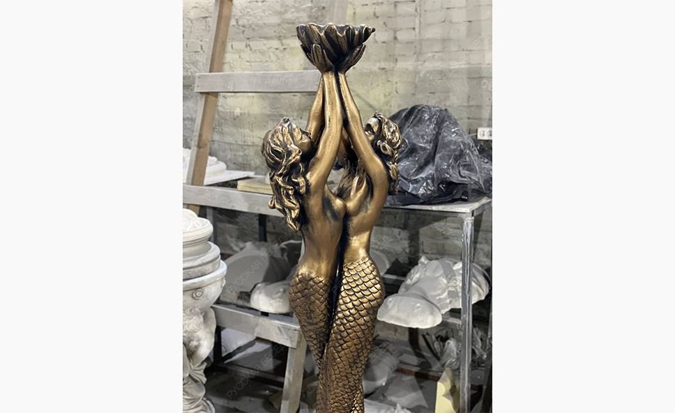 Универсальная садово-парковая композиция «Русалки» отличается чувственной пластичностью форм, филигранной детализацией фрагментов и обильной декорацией опорного основания. Русалки для сада могут использоваться как элемент ландшафтного декорирования, при необходимости украсить фасад здания, также выступить в качестве полноценного фонтана или в роли одного из его элементов. Парная статуя русалок с массивным декоративным основанием и функциональным навершием в виде чаши-ракушки, которую можно использовать в качестве вазона или фонтанчика. Наши скульптуры зарекомендовали себя как универсальный ландшафтный и архитектурный декор. Также их можно использовать как элементы больших уличных фонтанов. Бетонная скульптура в отделке под классическую бронзу хорошо приспособлена к условиям российского климата и сохраняет свой первоначальный внешний вид на протяжении многих сезонов. Создавая эту скульптуры, мы выбрали позу, которая во всех нюансах раскрывает красоту и грацию женского тела. Статуи отличаются безупречными пропорциями, реалистичной пластикой и тонкой проработкой деталей. Массивное основание имеет богатый декор и служит надежной опорой, которая обеспечивает устойчивость скульптуры на любой поверхности. Наших русалок успешно используют в качестве садовых статуй, архитектурных элементов частных домовладений и общественных заведений. В руках русалки удерживают чашу-ракушку. Она придает статуе визуальный баланс, уравновешивая массивное основание, и расширяет варианты ее использования. Благодаря чаше скульптуру можно задействовать как небольшой вазон, садовый фонтанчик или элемент большого фонтана в Москве. Для этих целей на этапе отливки мы закладываем в изделие силиконовый шланг. Установив на его конце насадку-распылитель и подключив к системе подачи воды, скульптуру преобразит эффектная струя в виде купола или гейзера. Скульптуры созданы из высокопрочного полимербетона с добавлением присадок, которые улучшают эксплуатационные характеристики материала. Отливка изделий произведена на вибростоле. Отработанная временем технология формовки позволяет добиться равномерной усадки смеси и достичь однородной структуры без полостей и других усадочных дефектов, присущих кустарному литью. Для придания дополнительной прочности скульптуры армируют. Декоративная отделка под классическую бронзу выполнена проверенными фасадными красками, не боящимися влаги, выгорания, растрескивания на морозе. Многоэтапная технология отделки предусматривает шлифовку, грунтование изделия, нанесение защитного покрытия для бетона. Краска наносится в несколько слоев с проработкой светотеневых эффектов, которые делают имитацию бронзы более реалистичной.