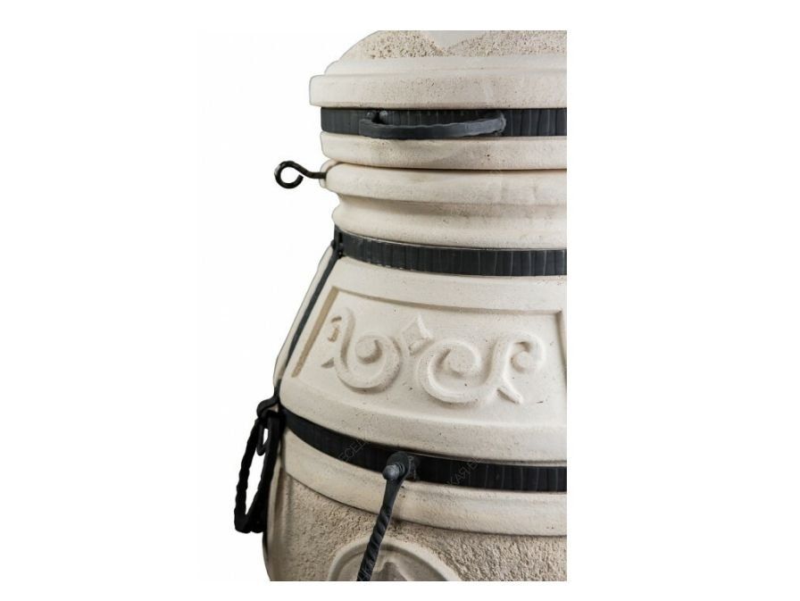 Широкая и уплощенная форма дна позволяет закладывать большее количество дров. При толщине стен в 5,5 см обеспечивается равномерный жар на 1,5 – 2 часа. Этого времени достаточно для приготовления еды без дополнительной растопки в несколько заходов. Внутренний объем вмещает 12 шампуров, а благодаря металлическому каркасу с коваными ручками, его можно легко переносить с места на место.